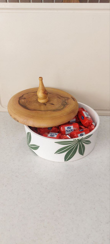 شکلات خوری سرامیکی ۱۶سانت با درب چوبی با بسته بندی (جعبه کادویی ) و مقداری شکلات خوشمزه مخصوص هدیه دادن به دوستان