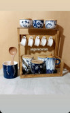 ست شش تیکه بانکه پاسماوری و جا ادویه سرامیکی طرح اسکرافیتو آبی رنگ با استند چوبی و جاقاشقی و روغن ریز و پنج عد سات قهوه