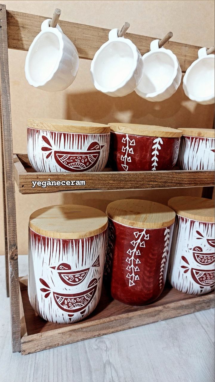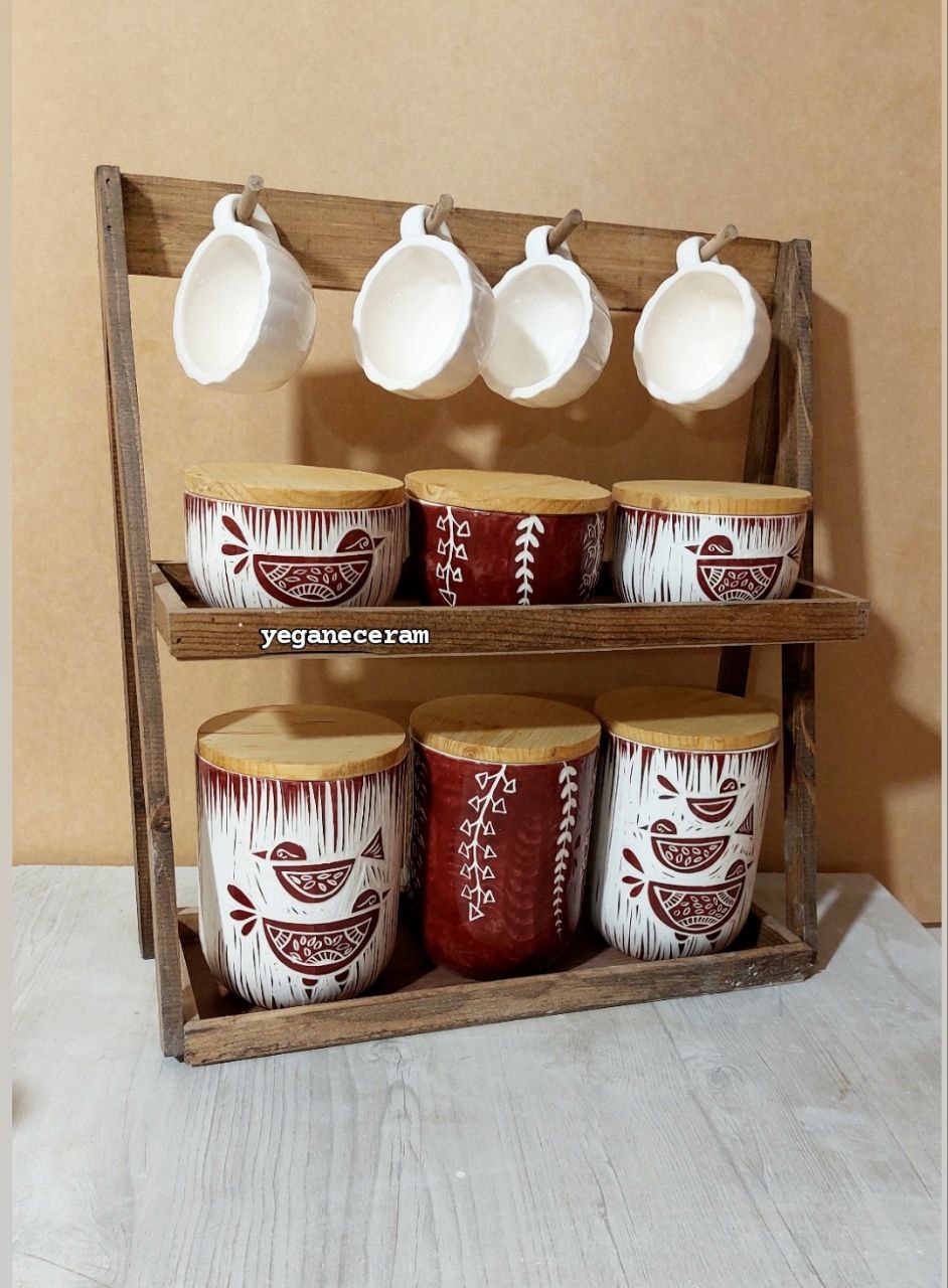 ست شش تیکه بانکه پاسماوری و جا ادویه سرامیکی طرح اسکرافیتو رنگ زرشکی با استند و فنجان دالبر