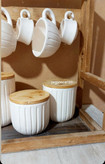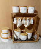 ست شش تیکه پاسماوری و جا ادویه سرامیکی طرح شیار دار ،با ست سه تیکه شکلات خوری و فنجان شیار دار و سه عدد شات قهوه خوری با استند چوبی