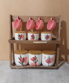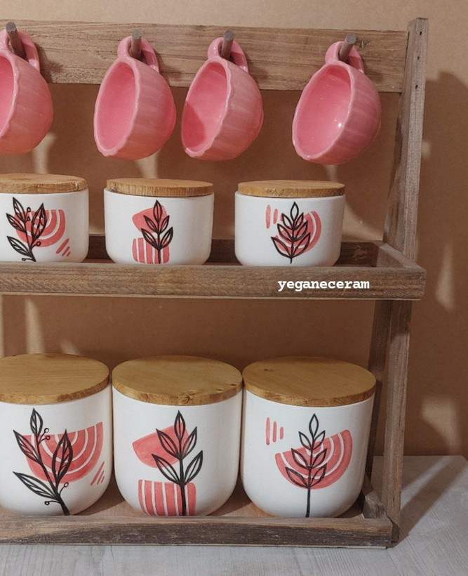 ست شش تیکه پاسماوری و جا ادویه سرامیکی طرح مینیمال صورتی با استند چوبی و شات قهوه خوری