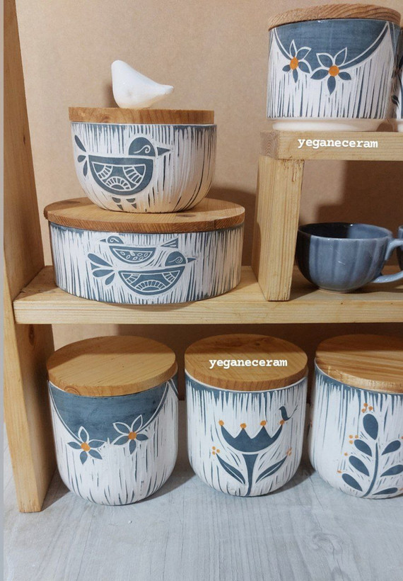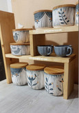 استند چوبی پازلی و ست پاسماوری و جا ادویه سرامیکی طرح اسگرافیتو خاکستری جهیزیه طبق عکس