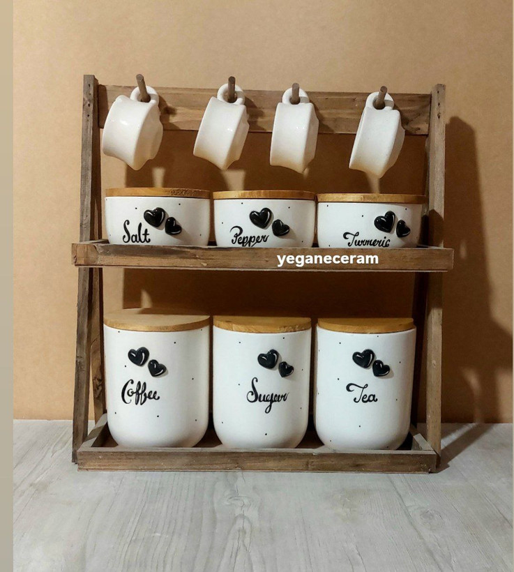 پاسماوری و جا ادویه سرامیکی طرح قلب برجسته ست شش تیکه استند چوبی.