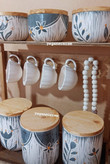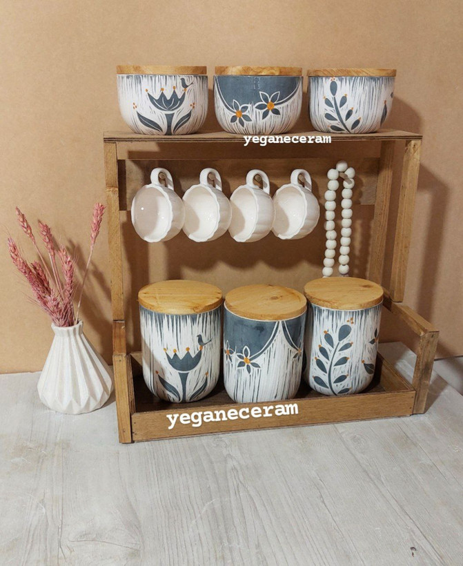 استند چوبی ست شش تیکه پاسماوری و جا ادویه و چهار عدد شات قهوه طرح اسگرافیتو