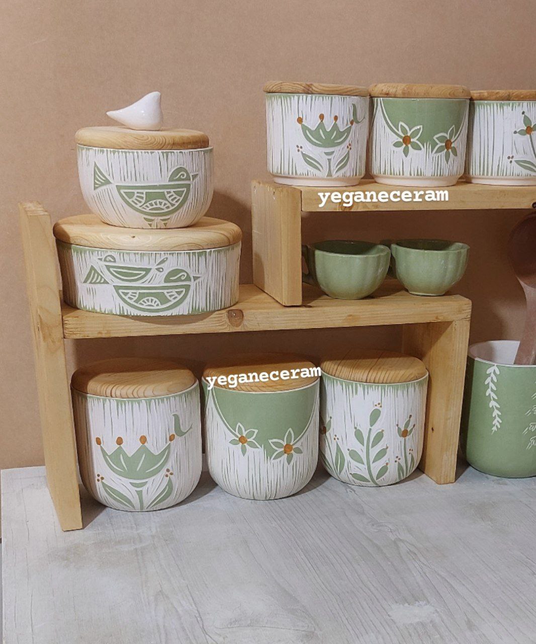 استند چوبی پازلی و پاسماوری و جا ادویه سرامیکی و شکلات خوری طرح سبز پسته ای جهیزیه طبق عکس