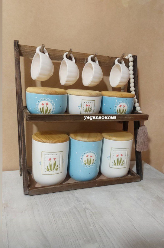 استند چوبی و شات قهوه و ست شش تیکه پاسماوری و جا ادویه سرامیکی طرح آب پاستلی جهزیه کپی
