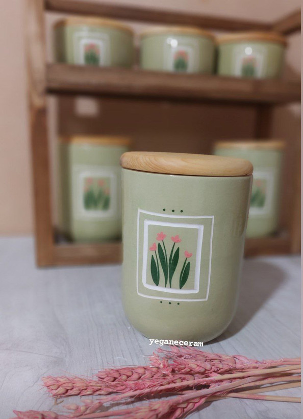 استند چوبی و ست شش تیکه پاسماوری و جا ادویه سرامیکی طرح سبز پاستلی طرح مربع جهزیه