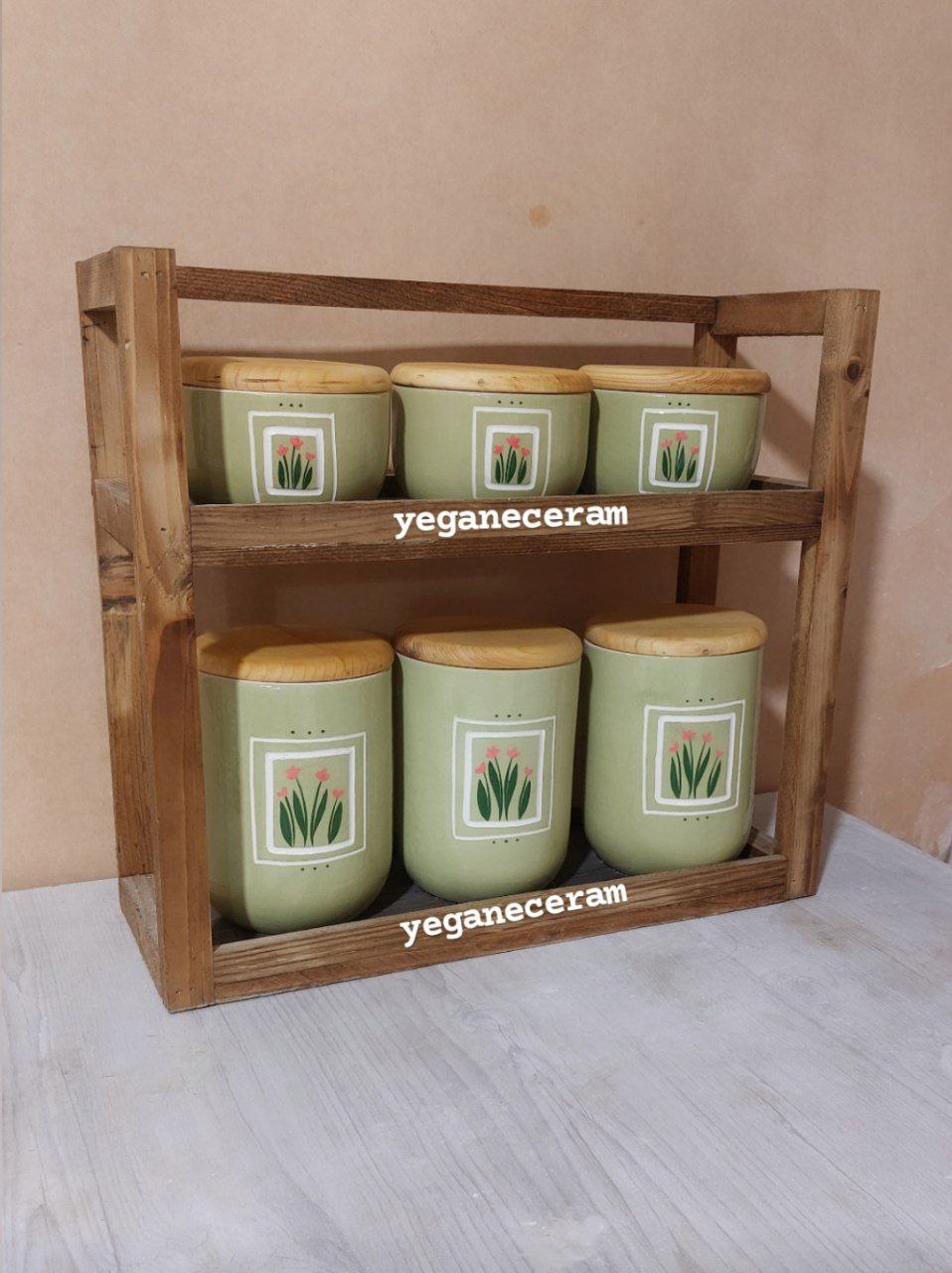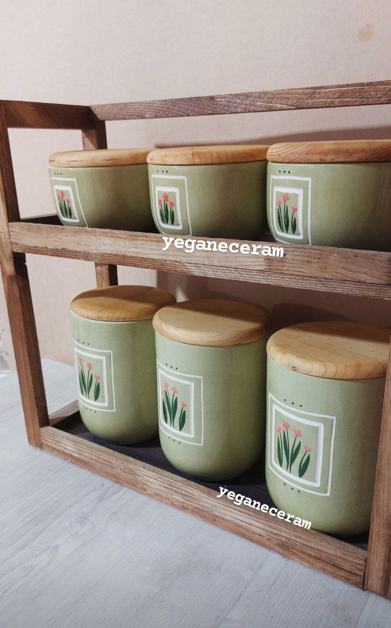استند چوبی و ست شش تیکه پاسماوری و جا ادویه سرامیکی طرح سبز پاستلی طرح مربع جهزیه
