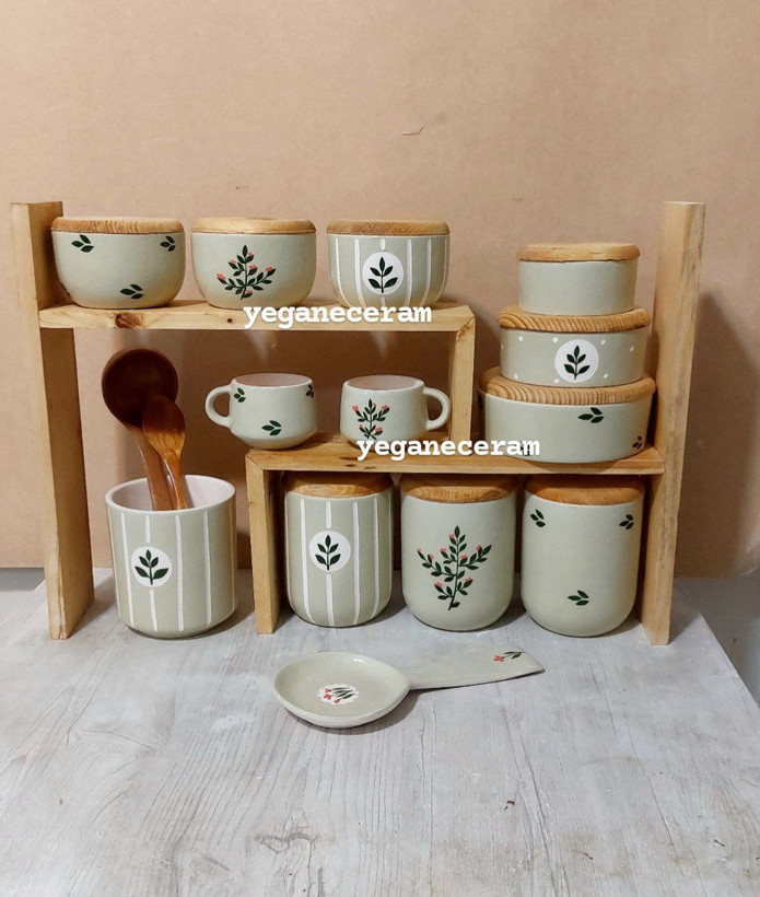 استند چوبی پازلی وست کامل پاسماوری و جا ادویه سرامیکی و شکلات خوری و... طرح سبز کرمجهیزیه طبق عکس