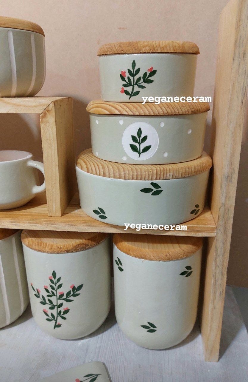 استند چوبی پازلی وست کامل پاسماوری و جا ادویه سرامیکی و شکلات خوری و... طرح سبز کرمجهیزیه طبق عکس