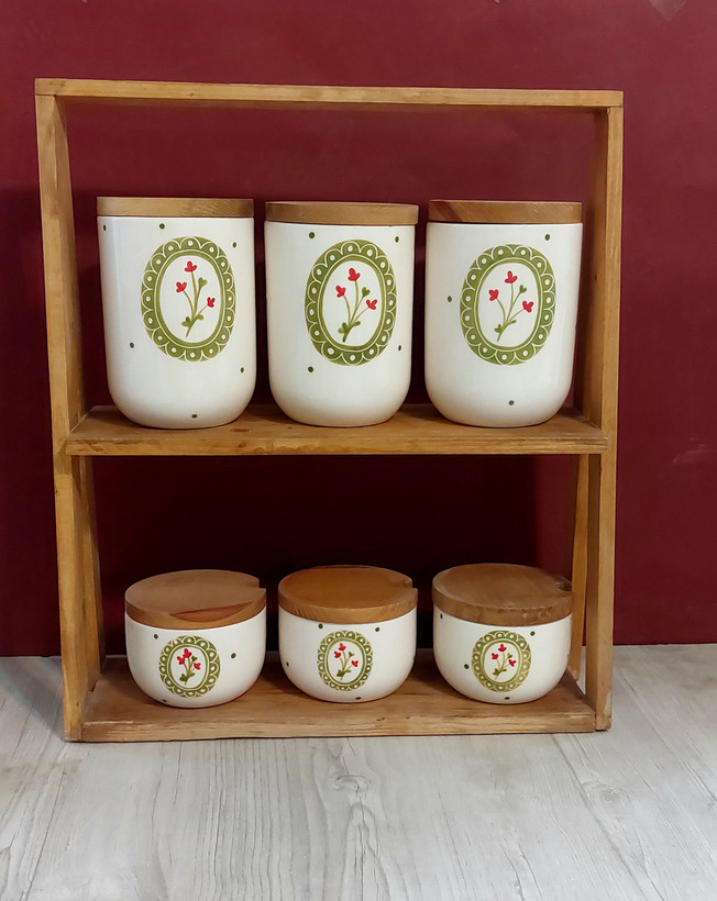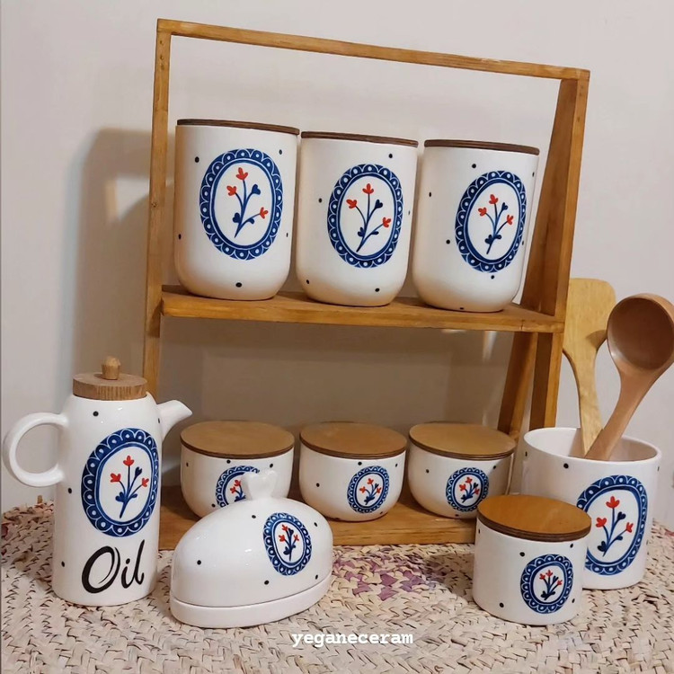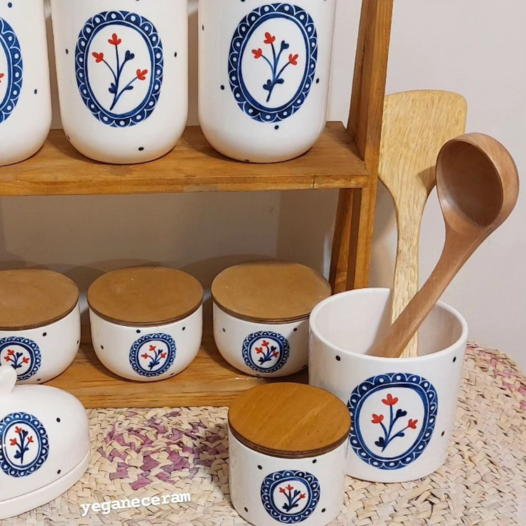 ست پاسماوری جاادویه ، جاقاشقی، روغن ریز، کره خوری و قندان، طرح گل سرخی دور آبی و یا دور سبز از جنس سرامیک مصرفی و لعاب خورده دوبار کوره رفته و کاملا قابل شستشو طرحها با دست و با رنگهای کوره ای کار شده جنس دربهای چوبی میتونه این کار ( داخل عکس) یا چوب کاج باشه.