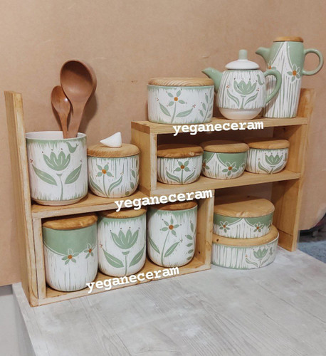پاسماوری و جا ادویه و سه عدد باکس سرامیکی طرح اسکرافیتو سبز با استند چوبی