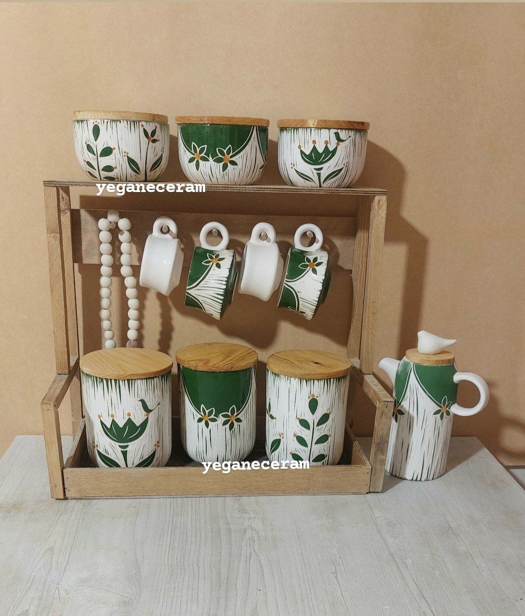 پاسماوری و جا ادویه سرامیکی شش تیکه استند چوبی و دوعدد فنجان و دو شات و روغن ریز طرح اسگرافیتو سبز